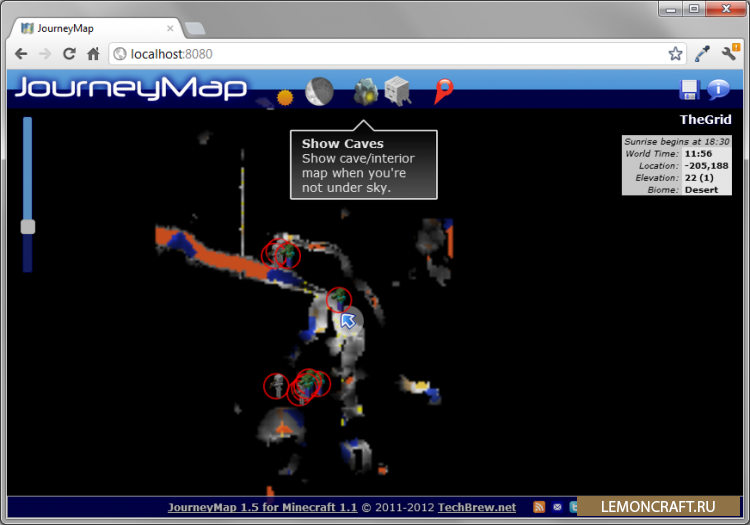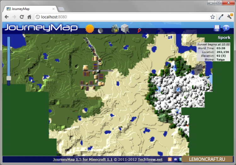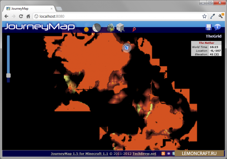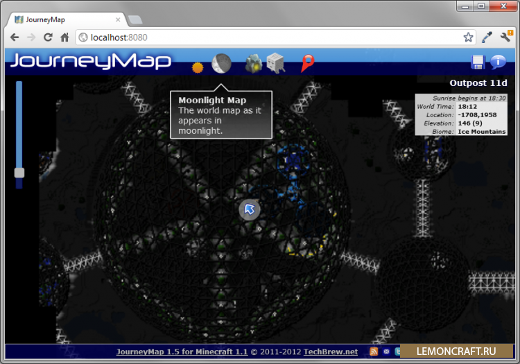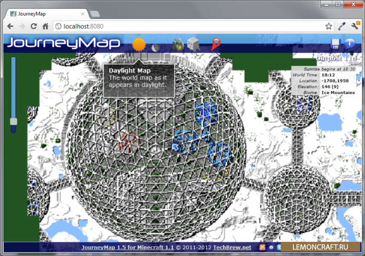 С помощью мода JourneyMap можно будет посмотреть полную карту мира в своем браузере. Также в версиях для Minecraft 1.6.4, 1.7.10 и 1.8 появилась отличная мини-карта. Чтобы открыть карту введи в адресную строку браузера: localhost:8080 (Для 1.6.4/1.7.10/1.8 необходимо включить веб-карту в настройках мода)